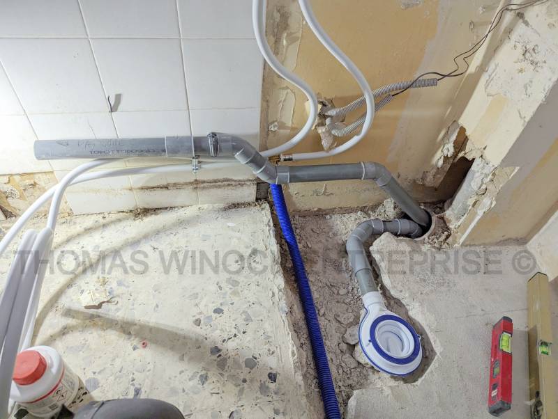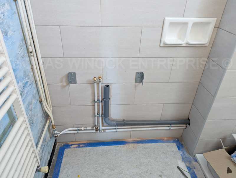 Les tuyaux utilisés par Winock Entreprise sont des tuyaux multicouche NICOLL FLUXO 16x 2 mm, du tuyau gainé pour la partie encastré dans le ciment coulé. Pour le bac à douche, Thomas Winock Entreprise et le client ont choisi un receveur en résine plein, pour s’assurer d’avoir une rigidité parfaite et éviter tout problème de fuite dû à une déformation du bac sous le poid lors de l’utilisation. La porte de douche est traité anti calcaire et les robinets installés par Winock Entreprise sont de marque GROHE.